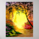 Pintura de uma floresta com a luz do sol à frente da trilha.