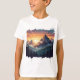 This stunning T-shirt design features a breathtaking sunset over majestic mountain peaks, surrounded by deep green pine forests. Warm golden sunlight radiates across the sky, blending beautifully with dramatic clouds and layered mountain silhouettes. The artistic paint-splash effect adds a modern, creative touch, making it perfect for nature lovers, hikers, adventurers, and outdoor enthusiasts.