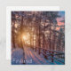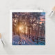 Vista do pôr do sol na floresta de pinheiros nevados com raios solares a atravessar e caminho de madeira para relaxar a caminhada. Coberto de pinheiro de neve, abeto e árvores de abeto. Floresta de inverno