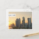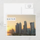 Cartão-postal dos arranha-céus na linha do horizonte comercial de Doha, capital do Catar, país árabe do Golfo, no pôr do sol, com um quadro branco e o texto: "Catar".