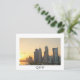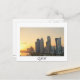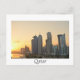 Cartão-postal dos arranha-céus na linha do horizonte do centro comercial de Doha, capital do Catar, país árabe do Golfo, no pôr do sol, com uma fronteira branca, e o texto: "Catar".