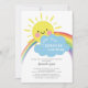 Um pequeno convite de chá de fraldas solar apresentando o sol mais sorridente com um arco-íris para um chá de fraldas neutro. Sacudir que convidamos para ver um arco-íris de aquarela para um toque especial extra