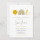 Este primeiro convite de aniversário apresenta um arco-íris pastel azul e mostarda esquisito com elogios ao sol e uma letra elegante. Este é o convite de aniversário perfeito para sua celebração boêmica, verão ou jardim.