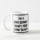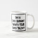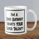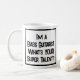 Slogan engraçado em uma caneca de café que diz "Eu sou um Baixista. Qual é o SEU super talento?". Caneca de café para um Baixista ou Tocador de Baixo. Texto em negrito preto e branco.