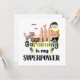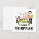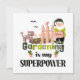 Uma bela ilustração de jardinagem mostrando uma cerca, um gnomo, um gato e dois adoráveis rabanetes, e uma mensagem dizendo: Jardinagem é meu super poder.