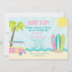 Surf! Convite de aniversário com pranchas cor-de-rosa e carrinha de surf. Perfeito para uma festa de piscina ou praia.
