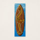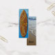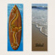 Inspirado pelos calções e camisas de aloha dos anos 60, esse padrão corante combina listras de competição, hibiscus e uma ilha de palmeiras. O padrão cai para a madeira natural do surfboard. Personalize o marcador com seu próprio ditado ou use o nosso. O verso é uma fotografia original de uma bela praia tropical.