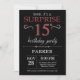 Surpreenda o 15o convite do aniversário com fundo preto e vermelho do brilho. Quadro. Aniversário de criança. Senhora Adolescente Adolescente Bday Convite do menino ou da menina. Alguma idade. Para uma personalização mais adicional, clique por favor "personalizam-no" botão e usam-nos nossa ferramenta de design para alterar este modelo.