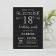 Surpreenda o 18º Convite de Aniversário com o Fundo de Negra e Silver Glitter. Chalkboard. Aniversário Adulto. Homens ou Mulheres no Dia Convidam. Qualquer idade. Para mais personalização, clique no botão "Personalizar" e use nossa ferramenta de design para modificar este modelo.