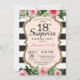 Surpresa 18º Convite de Aniversário para Mulheres. Convidar Festa de aniversário preto e Dourado. Dourada Glitter. Flor Floral Cor de Água Rosa. Black and White Stripes. Digital Imprimível. Para mais personalização, clique no botão "Personalizar" e use nossa ferramenta de design para modificar este modelo.
