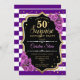 Surpreenda 50º Convite de Aniversário. Design preto feminino, branco, roxo, com ouro brilhante falso. Apresenta faixas, rosas roxos, fontes de script e confetti. Perfeito para uma bolsa mensageifesta de aniversario elegante. Pode ser personalizado para mostrar qualquer idade. Envie-me uma mensagem se precisar de mais personalização.