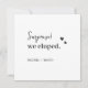 Cartões de Convite para Recepções de casamento "Surpresa que fugimos" exclusivos para recém-casados | Cartão de Casamento Simples de Elopemento Preto e Branco sem Foto | Elopement Convite de festas de anúncio online | Publicámos anúncio e recebemos convite | Anúncio de Elopemento Digital no Facebook Mídia Social Anuncie seu elogio com graça e charme usando nossos Convidados de Cerimônia de Elopemento modernos. Convide seus amigos e família mais próximos a se juntarem a vocês para celebrar este capítulo íntimo de sua jornada. Explore a nossa coleção e faça do seu anúncio de elopemento uma obra de arte. Comece para sempre com estilo - compre agora!