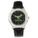 Um relógio de dinossauro verde trex personalizado com o nome das crianças ou a letra monográfica. Design de relógio do relógio pré-histórico do T rex para festas de aniversário de meninos. Faça um para filho, neto, novo bebê, neto etc. Ilustração de desenho animado pré-histórico t-rex para crianças. Tyrannosaurus rex.