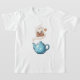 A delightful and energetic cartoon illustration featuring a round, baby-blue teapot decorated with classic white polka dots. Billowing from the spout is a magical swirl of steam that lifts up a cheerful anthropomorphic tea bag. The tea bag character is bursting with excitement, displaying large, sparkling anime-style eyes, blushing cheeks, and a wide open smile, surrounded by twinkling stars in a display of pure morning joy.