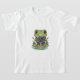 Capture a moment of pure charm with this delightful artwork featuring a tiny, enthusiastic nature photographer. The illustration centers on a bright green, wide-eyed frog standing proudly on a small island patch. Dressed in cute blue shorts, this amphibian shutterbug grips a detailed, retro-style silver and brown camera with both hands, ready to take the perfect shot. The serene pond setting includes floating lily pads, a blooming pink lotus flower, and tall cattails swaying in the background, all rendered in a vibrant, clean cartoon style that highlights the joy of exploration.