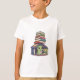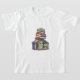 An adorable illustration featuring a chubby green caterpillar with big, sparkling eyes nestled inside a whimsical house built entirely from hardcover books. The character sits cross-legged on a pink cushion, sipping from a delicate white teacup, accompanied by a steaming glass teapot nearby. The roof of the book-nook supports a towering, colorful stack of vintage volumes in shades of red, teal, pink, and brown, creating a charming and scholarly vertical composition against a white background.
