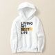 This design features a bold, clean, black typography statement: "LIVING MY BEST LIFE." The word "BEST" is highlighted by a casual yellow or gold paint swipe underneath, giving the design a touch of color and artistic flair. The overall aesthetic is minimalist, modern, and highly versatile. It's the perfect design for anyone embracing self-love, happiness, and an optimistic outlook on life. It serves as a great daily affirmation and a stylish piece of casual wear.
