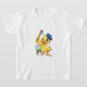 A heartwarming scene featuring a cute yellow duckling character posing as a talented painter. The little bird wears a blue beret speckled with colorful paint splotches and holds a large brush with red and blue tips high in the air. Beside the duck stands a wooden easel showcasing a vivid landscape painting with a bright sun, clouds, and green hills. The character's joyful expression and the playful paint splatters on its feathers and the floor create a lively and creative atmosphere.