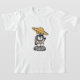 This stellar digital artwork portrays a charming penguin explorer suited up for deep space travel. The adorable flightless bird is decked out in a white pressure suit with bright orange straps and a high-tech chest control panel, its happy face visible through a clear bubble helmet. Standing proudly on a grey, cratered asteroid and waving a friendly flipper, the character is framed by a magnificent yellow and orange ringed planet floating in the background. The design captures a spirit of intergalactic adventure with clean lines and a vibrant, friendly aesthetic.