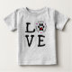 Este t-shirt do jérsei da multa do bebê mostra seu amor para animais e salvamento do animal. A palavra "amor" é soletrada com a letra O representada por um impressão da pata com um interior vermelho do coração cercado pelas palavras adota, promove e salva separado com impressões roxos da pata. Este é um grande presente para o senhor mesmo ou todo o amante dos animais. Isto podia igualmente ser usado pelos abrigos animais como um artigo do raffle ou em um fundraiser silencioso do leilão.