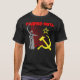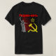 Estátua soviética famosa da era com martelo, foice, e estrela. Texto cirílico da "terra do russo mãe"
