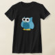 Ilustração de coruja azul-branca em uma camisa de cor escura.