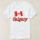 Grandes letras vermelhas soletram Calgary, uma grande cidade da Província de Alberta, com uma bandeira canadense ondulada voando atrás dela. Esse design está disponível em uma grande variedade de t-shirts, presentes e outras roupa.