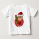 Baby T-Shirt com a ilustração de um lindo menino feliz sorridente, ele está vestindo fantasia de Papai Noel vermelho e branco e segurando um presente; design de Natal