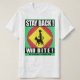 Silhueta de uma mulher que anda um cão no fundo amarelo do sinal do cuidado. Texto: : Estada para trás! Morderá! … e cão não é tão amigável tampouco!"