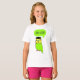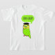 Uma camiseta com desenho de um periquito verde que está vestindo um berço negro na moda e dizendo: "Bon Jour!" (que significa 'Olá' em francês)