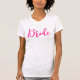 Esta camiseta divertida é acentuada com Bride escrito em um roteiro cor-de-rosa brilhante na frente e Informações da Festa de solteira no verso, fazer perfeito para a noiva na Festa de solteira! As informações de Festa de solteira podem ser facilmente apagadas se preferirem. Confira a coordenação das T-shirts Bright Pink para Babe das Bridesmaids na Coleção de Bachelorette Rosa.