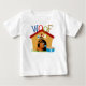 Um cachorro fofo com uma bola e um prato de comida, uma casa de cachorro, e texto colorido que lê WOOF em T-shirts de Cachorro, camisetas compridas de manga, fatos-tronco, fatos de futebol, capuzes orgânicos, capuzes de pullover, camisolas de camisola, roedores, chapéus e outras crianças, bebê e roupa de bebê!