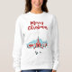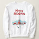 Uma camisola com uma imagem digital de uma ilustração pintada de uma igreja vermelha e uma torre. Uma estrela de Natal brilhante brilhando. Famílias à frente chegando para uma igreja. A neve de inverno cobrir o chão e repousa em pinheiros fofos. Feliz Natal escrito em uma fonte vermelha.