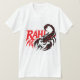 Um close-up de um homem vestindo uma camiseta branca com um design gráfico ousado de um escorpião em vermelho e preto.