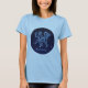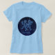 Tee apresentando o símbolo do zodíaco para Gemini em azul-prata-suave, como medalhão-redondo, sobreposto às estrelas da constelação, contra um fundo do céu estrelado formando de azul-da-meia-noite a preto.