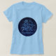 Tee apresentando o símbolo do zodíaco para Sagitário em azul-prata-mole, como medalhão-redondo, sobreposto às estrelas da constelação, contra um fundo do céu estrelado formando de azul-da-meia-noite a preto.