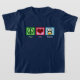Um sinal de paz, um coração e um pinguim bonito numa camiseta preta para crianças.