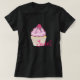 Chá preta com uma ilustração de um cupcake delicioso. Glacé rosa e garoa de chocolate. Um cupcake amarelo e uma framboesa no topo. Meu Deus! O fundo é uma textura de abstrato roxo com pequenos corações salpicados por todo o lado.