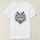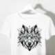 sua majestosa design de camiseta geométrica de raposa, com tons pretos e cinzas profundos, um fundo simples e olhos pretos para um olhar simples e poderoso.