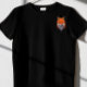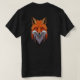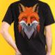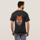 sua majestosa design de camiseta geométrica de raposa, com tons pretos e cinzas profundos, um fundo simples e olhos pretos para um olhar simples e poderoso.