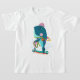 Esta ilustração alegre mostra uma baleia menina cavalgando um patinete com um colar feito de corais e estrelas cintilantes em seu pescoço, e um pequeno e engraçado capacete protegendo sua cabeça. Suas costas são enfeitadas com uma tatuagem floral, que cria um delicado contraste com os tons azuis e turquesas de sua pele.