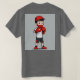 Esta imagem mostra um menino vestindo um boné vermelho e branco de beisebol, uma camiseta preta com sotaques vermelhos, shorts pretos e tênis brancos com laces vermelhos. Ele tem uma expressão determinada e se posiciona em uma posição pronta com luvas vermelhas de boxe sobredimensionadas em ambas as mãos. Uma faixa branca ou cinta está amarrada em volta da cintura, contrastando com a roupa escura. O fundo é uma cinza sem som, e a pose do garoto sugere que ele está preparado para uma partida de boxe ou sessão de treinamento