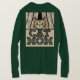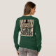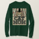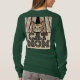 Esta é uma camiseta da Mãe Gata mostrando um gato espreitando através de uma cortina. A imagem é uma ilustração de estilo cômico com texto retrorado prateado. As palavras "Cat Mãe" estão em grandes textos retrorreflectores de prata e preto sob a imagem. A imagem do gato está na frente e atrás da camiseta. A camiseta é uma camiseta básica de manga longa e verde de mulheres.