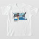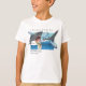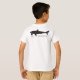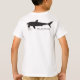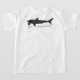 Ilustração de cor do tubarão estranho Helicoprion na parte dianteira, silhueta preto e branco na parte traseira.
