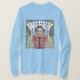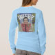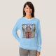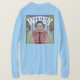 Camiseta longa de manga azul-esbranquiçada A trabalho de arte apresenta uma ilustração cômica de uma mulher bonito com olhos azuis. Ela está sentada nos degraus da frente de uma casa e sorrindo. Ela está vestindo um suéter listrado vermelho e branco e um cachecol verde. O fundo é um pátio com árvores e um céu azul. A palavra Wifey está em letras grandes brancas. A imagem está na frente e atrás da camiseta. Você pode alterar a imagem com o botão Personalizar.