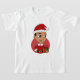 Camiseta infantil com ilustração de um sorridente rapaz hispânico/latino com cabelo preto curto, o menino está vestindo uma fantasia de Papai Noel com um chapéu vermelho e segurando um presente; num círculo vermelho sobre fundo branco, um design de Natal feriado