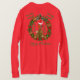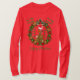 Suéter de Natal muito feio (t-shirt) com coroa verde de Natal, ornamentos de ouro e vermelhos, e um pássaro bonito com um chapéu de Papai noel vermelho. Texto escrito em branco, tudo personalizável. Por Criações Miri - Criadas Para Você Só Com Você Em Mente. Todos os direitos reservados.