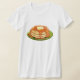 Este design é um cheio de pratos de panquecas deliciosas. No prato estão três panquecas com xarope de bordo rolando sobre eles e um pouco de manteiga derretendo no topo. Eles parecem tão deliciosos. Este design de panquecas parece excelente nesta camiseta feminina. Perfeito para si mesmo ou como presente
