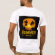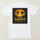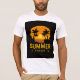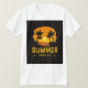 Uma vibrante design de camiseta de verão apresentando um tema tropical com palmeiras, sol brilhante e ondas do oceano. A trabalho de arte inclui cores ousadas e alegres como turquesa, amarelo e coral, complementadas por fontes minimalistas ou letras lúdicas desenhadas à mão. Ideal para um olhar casual e certeiro que celebra o calor e a alegria do verão.