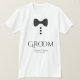 Estes t-shirt do divertimento são projetados especialmente para o noivo. O t-shirt é branco e caracteriza uma imagem de um laço preto e de três botões. O texto lê o noivo, e tem um lugar para a data do nome e do casamento do casal do casamento. Grande adição a um saco dos ganhos do casamento.